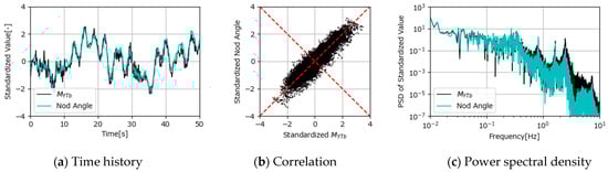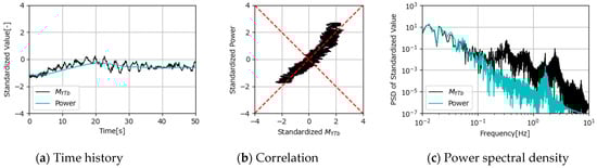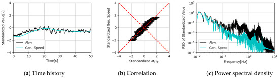The nacelle X acceleration (Figure 4, average wind speed 14 m/s) has a higher frequency component than MYTb, and the correlation between them is low. The nacelle X displacement (Figure 5, average wind speed 14 m/s) is strongly correlated with the tower’s first natural frequency of 0.34 Hz (and at frequencies below that), which is the main vibration component of MYTb. However, the correlation is weak at frequencies above that. The nacelle nod angle (Figure 6, average wind speed 14 m/s) is highly correlated with the high-frequency components above 0.8 Hz, compared with the nacelle X displacement. The hub thrust load FXN (Figure 7, average wind speed 14 m/s) is strongly correlated with the low-frequency components below 0.1 Hz and with the high-frequency components above 0.8 Hz, but is weakly correlated with the tower’s first natural frequency of 0.34 Hz. The pitch angle (Figure 8, average wind speed 14 m/s) was negatively correlated with the low-frequency components and the correlation was high at frequencies below 0.05 Hz. The power (Figure 9, average wind speed 8 m/s) is highly correlated with the components at frequencies below 0.05 Hz. The generator speed (Figure 10, average wind speed 8 m/s) is highly correlated with the low-frequency components below 0.05 Hz.