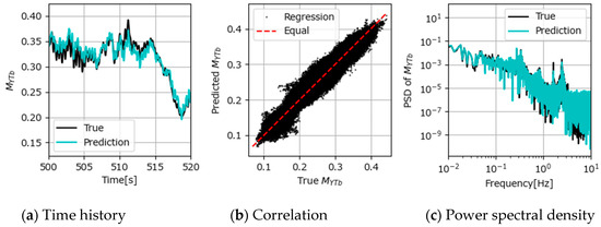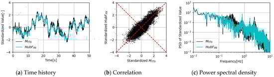 Figure 24g–i shows the results for the torsional torque at the bottom of the tower, MZTb. The prediction accuracy did not increase when the operating conditions were the only explanatory variables (Figure 24g) or when the nacelle displacement was added (Figure 24h). The R2 did not increase when the nacelle angle was added (Figure 24i) because the low-frequency components below 0.1 Hz could not be predicted (see Section 5.1); however, the fluctuation components above 0.1 Hz were predicted, so the fatigue load could be predicted.