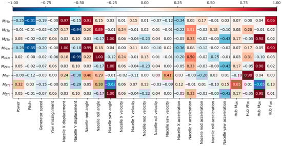 In this section, we outline our examination of the correlation between the objective and explanatory variables. The objective variables included the nine loads described in Section 3.2. The explanatory variables included four operating conditions, fifteen nacelle behavior variables, and four hub center loads. The Pearson correlation coefficients, which were determined based on the aeroelastic analysis results for 10 min periods with average wind speeds of 8 m/s and 14 m/s, are shown in Figure 11 and Figure 12, respectively.