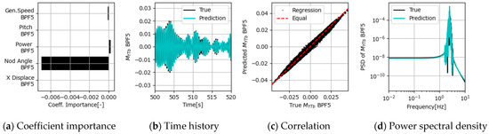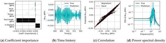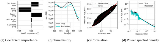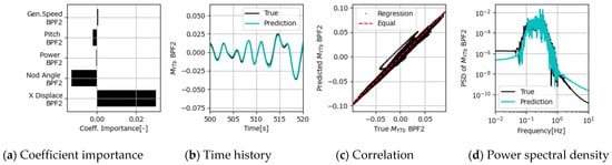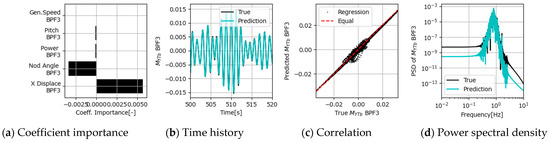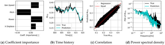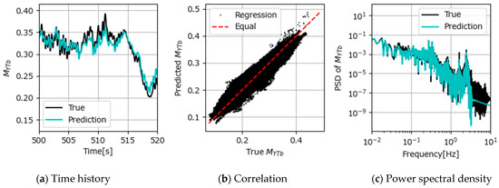 Figure 24d–f shows the results for the side–side bending moment at the bottom of the tower, MXTb. When the operating conditions were the only explanatory variables (Figure 24d), the prediction accuracy was low. However, fatigue and extreme loads were generally predicted when the nacelle displacement was added to the explanatory variables (Figure 24e), and a further increase in the predication accuracy was achieved by adding the nacelle angle (Figure 24f).