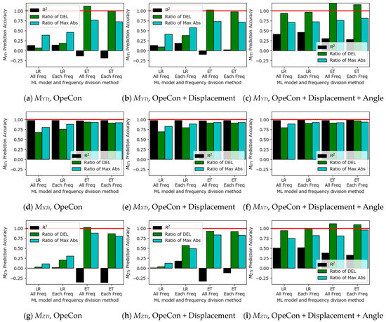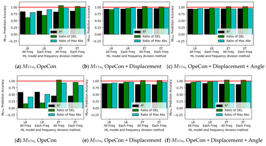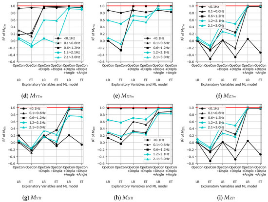 Figure 19a–c shows the coefficient of determination (R2) for each frequency band model for the tower’s base load. The horizontal axis shows the explanatory variables and the type of machine learning model. The results of the fore–aft bending moment, MYTb, are shown in Figure 19a. The model for the frequency bands below 0.1 Hz is accurate with the operating conditions only, which increases further when the machine learning model is changed from linear LR to nonlinear ET. The reason why the nonlinear model has a higher R2 is because the power and generator speed are rated above a certain wind speed and the pitch angle changes only above a certain wind speed, so they behave nonlinearly. For models with frequency bands above 0.1 Hz, the prediction accuracy is higher for the lower frequency bands when only the nacelle displacement is used; when the nacelle angle is added, the prediction accuracy is close to one for all the frequency bands.