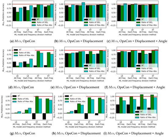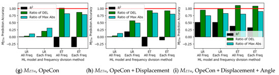 Figure 24a–c depicts the results for the fore–aft bending moment at the bottom of the tower, MYTb. Even when the operating conditions were the only explanatory variables (Figure 24a), the prediction accuracy was high. However, the three indices became approximately one after adding the nacelle displacement to the explanatory variables (Figure 24b) and using the nonlinear ET model and each frequency band model. The prediction accuracy increased further when the nacelle angle was added to the explanatory variables (Figure 24c), and the three indices became approximately one even when the linear LR model was used.