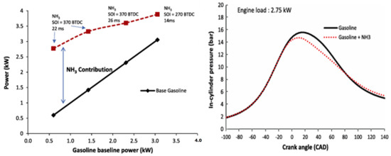In most literature, a secondary fuel is used as a promoter. In the case of the SI engine, gasoline was first used as a promoter for the combustion of ammonia in a conventional engine. Gasoline is there to boost ammonia ignition with its higher cetane number, leading to a shorter ignition delay time. A certain amount of gasoline was therefore required for combustion. In the same context, studies on ammonia and gasoline dual-fuelled SI engines were conducted by Ryu et al. [30]. Their study investigated ammonia combustion characteristics and emissions in an SI engine using gasoline port injection as a baseline (0.6 kW power). The finding showed that the total engine power increased to 2.7 kW when ammonia injection timing and duration were advanced to 370 BTDC and 22 ms, respectively. While the ammonia peak pressure was slightly lower than gasoline alone due to ammonia’s slow flame speed, the brake specific energy consumption (BSEC) stayed the same with gasoline-only operation, as can be seen in Figure 1. They reported that the use of ammonia resulted in CO emissions and an increase in NOx and HC emissions, with ammonia slipping because of incomplete combustion [30].