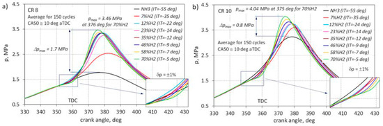 In-cylinder pressure traces for a compression ratio of eight (a) and a compression ratio of ten (b) [37].