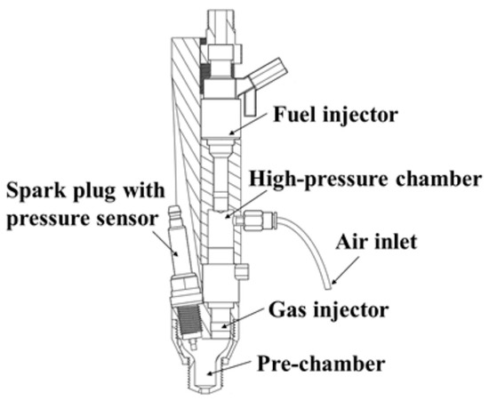 Recently, prechamber turbulent jet ignition (TJI) was used to aid ammonia combustion by employing a spark plug in a prechamber with multiple jet holes, accelerating the jet flame into the main engine cylinder. A numerical work at 3 MPa and 800 K predicted higher OH, O, and HNO radicals with a higher equivalence ratio in lean burn, leading to reduced NOx [45]. In an optical study [46], at 0.8–1.1 MPa and 500 K, TJI outperformed direct SI, reducing ignition delay by 60% and combustion duration by 47–77%, in turn, resulting in a rapid pressure rise rate. A study involving gaseous ammonia and air injection into the prechamber (see Figure 4) revealed improved combustion stability [47], allowing a spark timing lag from 40–45° to 22–28 °CA BTDC and reducing both NOx emissions and NH3 slip. Key factors influencing TJI performance are spark location, the geometry of prechamber and jet flame orifices, active pilot fuel injection, and prechamber scavenging (exhaust gas recirculation) [18].