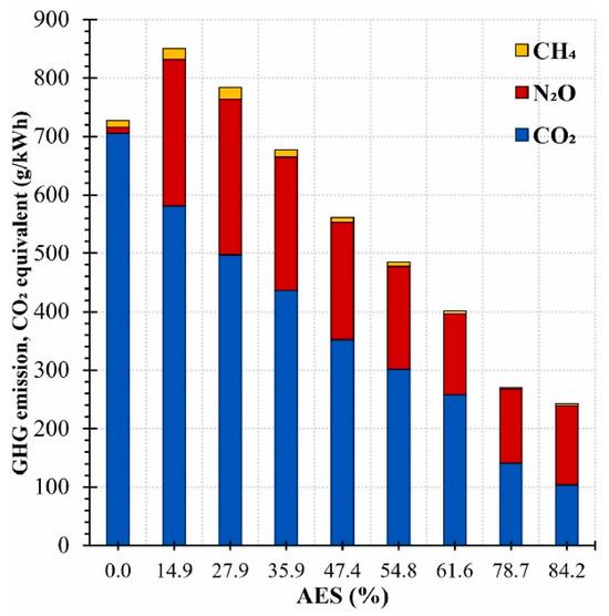 GHG emissions of an ammonia/diesel-fuelled engine for various ammonia/diesel ratios [60].