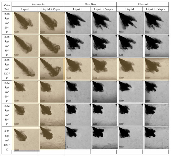 Another study investigated ammonia spray characteristics under various ambient pressure and temperature (air densities) conditions with a current GDI engine injector [70]. Ammonia was injected at 120 bar and 20 °C with an injection duration of 3.9 ms in a constant-volume 2.5 L chamber with a 30 bar and 200 °C pressured capacity. The Schlieren technique was used to capture and follow the liquid and vapor development of the spray. The experiment was conducted with various fuels (ethanol and gasoline), and a comparison was made. The findings showed differences in spray geometry and revealed how low air densities can impact ammonia spray penetration, causing it to exhibit longer morphology than ethanol and gasoline, resulting in jet collapse due to flash boiling. See Figure 6 comparing the spray shape of different fuels.