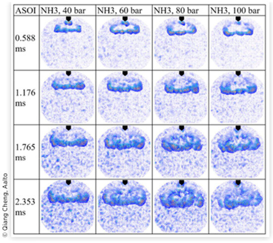 - Fan, Y.; Ohtomo, M.; Kasuga, S.; Iki, N.; Kurata, O.; Tsujimura, T.; Furutani, H. Characteristics of ammonia spray injected by pressure-swirl atomizers. In Proceedings of the International Conference on Liquid Atomization and Spray Systems (ICLASS), Edinburgh, UK, 22–26 July 2018. [Google Scholar]