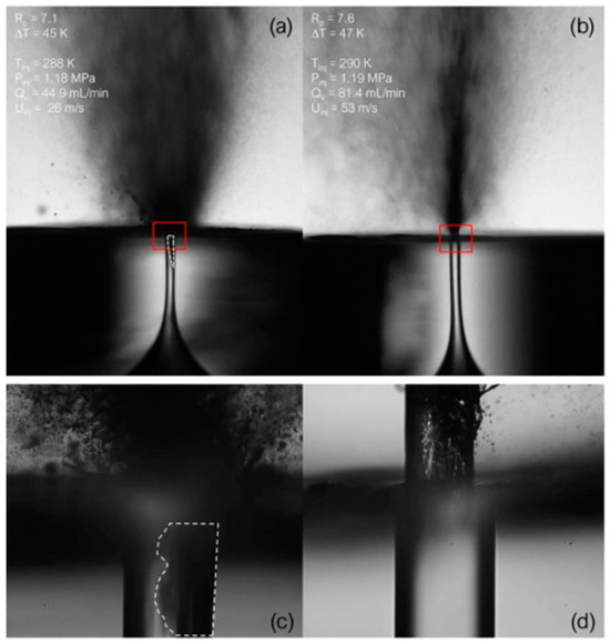The impact of a slight change in the orifice geometry and inner flashing, L/D = 11: (a) glass nozzle 9–2 with the reduced section and opening (Da,out = 0.19 mm, Da,min = 0.18 mm); (b) glass nozzle 9–3 with straight orifice after reduction (Db,out = Db,min = 0.18 mm); red represent the projected area for c and d: (c) enlarged image of (a); and (d) enlarged image of (b) [74].