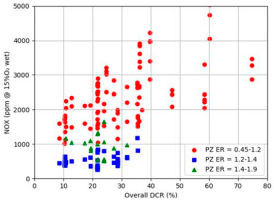 Since ammonia is primarily stored in its liquid phase, liquid ammonia’s direct combustion is the focus of renewed research for gas turbines, aiming to minimise fuel preparation and start-up. In a preliminary study [69], a single-stage swirl combustor used separate liquid ammonia (1.0 MPa at 295 K), methane, and air additions. With 70% ammonia in the fuel (by heat fraction) and an elevated 500 K inlet air temperature, stable flames occurred within a narrower ER range of 0.66 to 1.37. Optimal results showed NO and unburnt NH3 emissions near 1000 ppm and 100 ppm, respectively, at ER 1.06. The presence of methane led to a swift increase in toxic hydrogen cyanide (HCN) from 50 ppm at an ER of 1.06 to 200 ppm at an ER of 1.1. A study on a downsized industrial GT burner and local ammonia decomposition found that NOx emissions are optimal (see Figure 10) when the overall ER is between 1.2 and 1.4 and the decomposition rate of ammonia (DCR) is low, indicating a high ammonia concentration in the blend [86].
