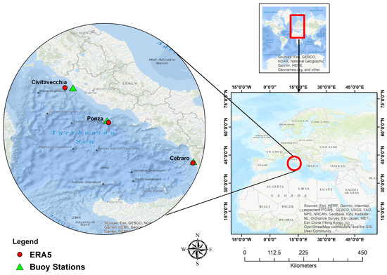 The area under examination in the current study is the central Tyrrhenian Sea, a portion of the Mediterranean Sea (Figure 1). The central Tyrrhenian Sea is characterized by its unique geographic and climatic features, which influence its wave and wind patterns. This semi-enclosed sea exhibits an irregular shape, shelter from the southerly storms by the large island of Sicily and prevailing westerly storms by Sardinia and Corsica. The sea is influenced by regional atmospheric conditions that can generate a range of wave climates. Therefore, wave data calibration and validation are important for accurate regional wave climate characterization. The continental shelf in this region is relatively narrow, and the coastline is varied, with an alternation of sandy beaches and rocky coasts and capes. The central Tyrrhenian Sea is situated near the large city of Rome, making it important both economically and in terms of environmental and archaeological values. This area is also noted for experiencing beach erosion, particularly at Ostia, which has necessitated various coastal protection measures [33]. The area, like much of the Mediterranean, experiences a microtidal regime, meaning it has very limited tidal ranges, often less than 0.5 m. This is due to the narrow connection between the Mediterranean and the Atlantic Ocean through the Strait of Gibraltar, which limits the influx of oceanic tides. This results in tide levels being primarily influenced by atmospheric pressure and local wind conditions rather than the gravitational pull of the moon and sun. The rainfall is characterized by wet winters and dry summers [48]. Precipitation tends to be more prominent during autumn and winter months, often associated with the passage of frontal systems. In contrast, summer is typically arid due to the presence of the subtropical high-pressure systems. The distribution of rainfall can be uneven and can sometimes result in heavy downpours, particularly during the transitional seasons.