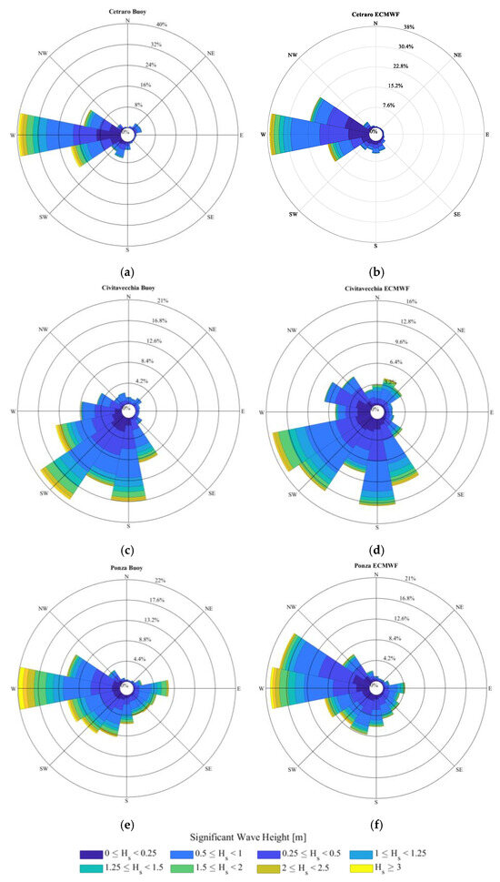 In this section, we compare the data obtained from wave buoys with the data from the ERA5 reanalysis for three locations: Cetraro, Civitavecchia, and Ponza. Specifically, we analyse the distribution of spectral significant wave height (HS) and peak period (TP) by plotting polar diagrams (wave roses) for both datasets, as shown in Figure 3. The number of hourly data points for each location is as follows: Cetraro has 98,095 data points, Civitavecchia has 63,509, and Ponza has 190,035. The HS values, in metres, are divided into eight classes, while the peak wave period, TP, in seconds, is categorized into five classes, as reported in Table 3.