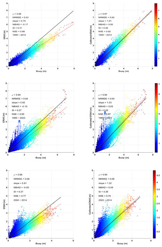 Scatter plots of the synchronous significant wave heights extracted from ERA5 wave models against the wave buoy and calibrated ERA5 datasets against the wave buoy for (Top) Cetraro (Middle) Ponza and (Bottom) Civitavecchia (Colorbar in metres).