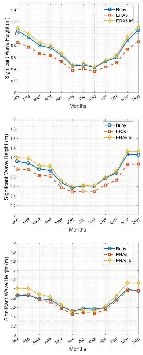 Figure 6 shows the average monthly significant wave height with higher waves experienced in the winter in contrast to the summer. The winter period is characterized by high wave heights traveling toward the coast. On average, the wave heights are higher than 1 m as recorded by the wave buoys. However, the underestimation is more glaring in this seasonal period as the model estimated average wave heights of less than 1 m in all sites. After the calibration, the seasonal variation of the wave parameters across the three locations is well reproduced, with the calibrated ERA5 data closely matching the measurements of the wave buoys. There is also an increase in the improvement from winter to summer of the calibrated ERA5.