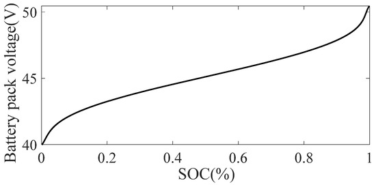 The nonlinear relationship between battery pack voltage (12 cells in series) and the SOC is shown in Figure 5, from where the polynomial is fitted as in Equation (5).