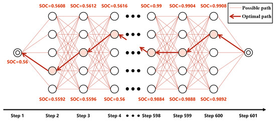 The field of DP falls under the domain of operations research, which involves solving optimization problems in decision-making processes. Dynamic programming is built upon Bellman’s principle by breaking down complex problems into approximate sub-problems, solving each sub-problem individually, and subsequently deriving a solution for the overall problem [31]. Under the known flight conditions, the energy distribution optimization problem for the hybrid-powered UAV is decomposed into N-stage decision problems. The selection of the SOC grid and time domain intervals is a trade-off: if the intervals are too small, the computational time increases significantly; if too large, the results are affected. In this study, the SOC grid precision is set to 0.01%, and the time domain interval is set to 1 s to align with the practical system’s sampling frequency. The software version used in this study is MATLAB R2018a, and an illustration of the state points falling on the grid points is shown in Figure 6.
