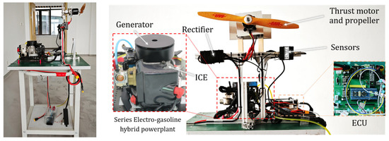 Despite the drawbacks of exhaust emissions and noise, gasoline and diesel remain indispensable for powering aircraft due to their dozens-of-times-higher energy densities compared to lithium batteries [1,2]. The traditional hybrid power system typically refers to the electric–internal combustion engine hybrid system. Based on the power layout configuration, hybrid power systems can be classified into three types: series, parallel, and series–parallel [3]. Airborne in-series electro-gasoline hybrid power provides power redundancy for the aircraft, enabling a controlled descent using battery power in the event of an unexpected failure of the internal combustion engine (ICE). By surpassing the limitations of mechanical transmission, a hybrid powertrain with an “ICE generates–motors thrust” mechanism has been introduced to facilitate distributed propulsion with blowing-wing thrust configuration, thereby enhancing short-distance take-off or vertical take-off capabilities [4,5]. Furthermore, owing to the distinctive peak-load shifting capability of the battery pack, the electro-gasoline hybrid power system adeptly adapts to load fluctuations during varying flight conditions [6].