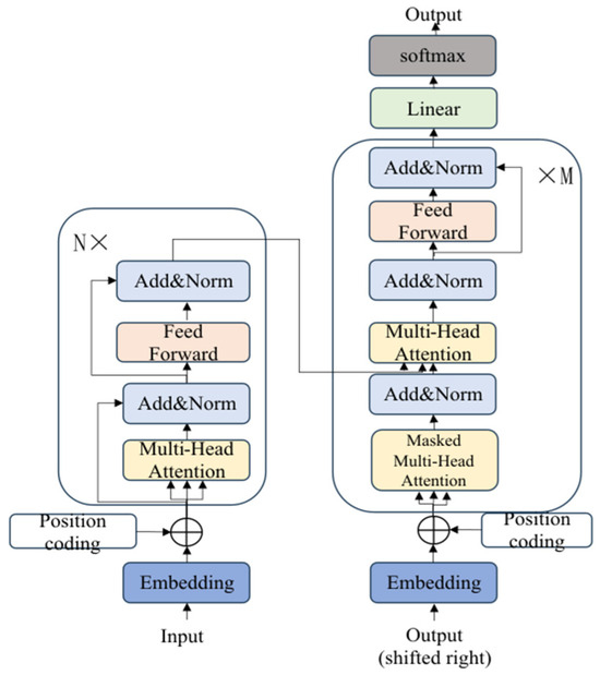 The decoder is composed of M identical sub-layers stacked together, each containing three modules. The masked multi-head attention is similar to the encoder’s attention but employs a masking mechanism to ensure that when generating each target token, it can only attend to all positions before the current one. The cross multi-head attention is primarily used to aggregate the global dependency features captured during the encoder phase and the features learned through masked attention. Finally, the output from the encoder is processed through a feedforward layer.