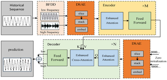 As shown in Figure 2, the encoder consists of an enhanced attention module and a forward propagation module. The input to the encoder is the high- and low-frequency component data obtained after best frequency domain decomposition. The component data are first segmented and embedded through data slicing and embedding, and then features are extracted by the enhanced attention module to produce the output of the different component data encoders. This process can be described in detail as follows: