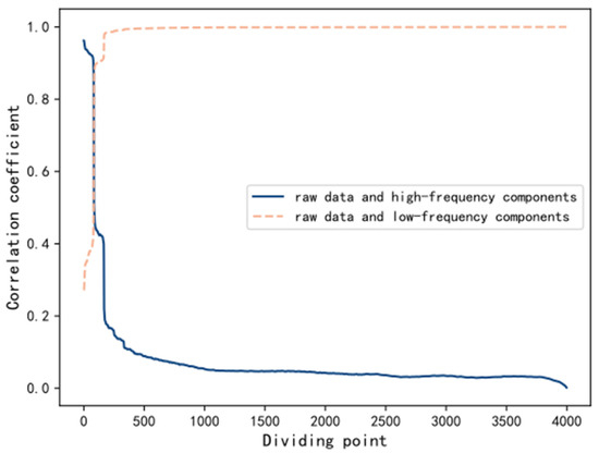 The correlation coefficient between the high and low-frequency components of different cut-off points and the original data.