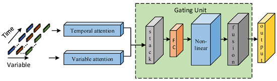 Unlike univariate prediction tasks, in multivariate prediction tasks, variables from different dimensions influence each other. Therefore, while considering temporal dependencies, it is also necessary to account for the interrelationships among the time series data variables. To address this issue, this paper proposes an enhanced attention module that captures spatiotemporal features. This module primarily utilizes temporal attention and variable attention to capture the relationships between the segmented sequences’ time dimensions and variable dimensions output by the DSAE module. A gating unit is then employed to merge these two dimensions’ features, thereby enhancing the model’s feature extraction capabilities. Its specific structure is shown in Figure 5.