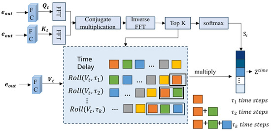 In the above formula, represents obtaining the largest translation lengths. Finally, based on the obtained translation lengths, the vector is shifted backward and then multiplied by its attention weight to obtain the data characteristics after time-delay aggregation. The specific calculation process is as follows: