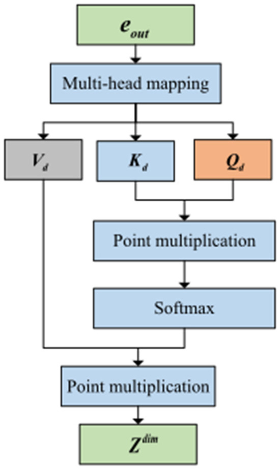 First, the result output by the DSEB module is mapped through the time dimension multi-head to obtain the query matrix , the key matrix , and the value matrix . The specific formulas are shown in Equations (12)–(14).
