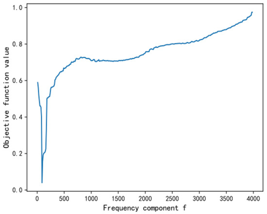 In Section 2.1.1, this paper constructs an objective function with the goal of minimizing the difference in the correlation coefficients between the high-frequency and low-frequency components and the original data. The frequency spectrum range of the input grounding current data is searched to find the point where the objective function reaches its minimum value, which is taken as the high–low frequency division point. The variation function of the objective value is shown in Figure 10. When the objective function reaches its minimum, the correlation between the high-frequency and low-frequency components and the original data is optimally balanced. The determined decomposition point can effectively separate steady-state and transient features, enhancing the component features contained in the data.