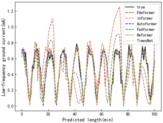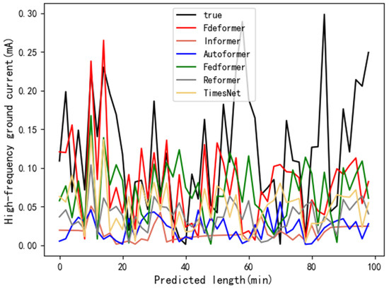 Figure 11 shows a comparison of the prediction results for the low-frequency components of the grounding current at the grounding point across different models. It is evident that Fdeformer outperforms the other time series prediction models in predicting the low-frequency components of the grounding current. At most time points, Fdeformer’s predicted values are nearly consistent with the actual values. In contrast, Fedformer, Autoformer and TimesNet exhibit significant prediction errors at certain time points. For instance, at the 43rd minute, the predicted values of Fedformer, Autoformer and TimesNet differ from the actual values by 0.11 mA, 0.13 mA and 0.13 mA, respectively, while Fdeformer’s prediction deviates by only 0.08 mA. Informer and Reformer, compared to the other models, can only provide a rough trend of the actual values and fail to achieve accurate predictions.