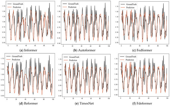 To validate the overall predictive performance of Fdeformer, predictions were made using both the aforementioned single models and the proposed method on both a self-constructed grounding current dataset and a public dataset. The input data length for the self-constructed dataset was 300 min, with predictions made for the grounding current for the next 100, 200, and 300 min. The error comparisons of the models on the self-constructed dataset are shown in Table 6. For the public dataset, the input length was 96, and the output lengths for predictions were 96, 192, 336, and 720. The error comparisons of the models on the public dataset are shown in Table 7, with bold black indicating the best prediction performance.