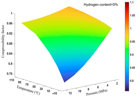 According to Figure 1, Figure 2, Figure 3, Figure 4 and Figure 5, the compressibility factor of the mixed natural gas varies with the hydrogen blending ratio and temperature under the same pressure conditions. It can be concluded that, under these five experimental conditions, the compressibility factor ranges from 0.76 to 1.10. The minimum compressibility factor of 0.7781 occurs when the hydrogen content is 5%, with the temperature and pressure set at −10 °C and 12 MPa, respectively. Conversely, the maximum compressibility factor of 1.0390 is observed at a hydrogen content of 40%, with the temperature and pressure at 110 °C and 12 MPa, respectively.