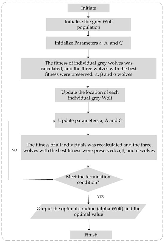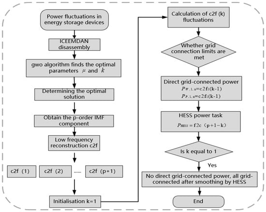 During the process of power decomposition using the ICEEMDAN method, the noise ratio parameter μ and the high/low-frequency power boundary point k have significant impacts on the final power decomposition results. Therefore, this paper employs the grey wolf optimizer (GWO) [27] to optimize these two parameters, aiming to obtain the optimal signal-to-noise ratio parameter μ and high/low-frequency power boundary point k. This will maximize the system’s response capability to power changes, thereby enhancing the accuracy and efficiency of power allocation in the hybrid energy storage system. The steps are as follows: