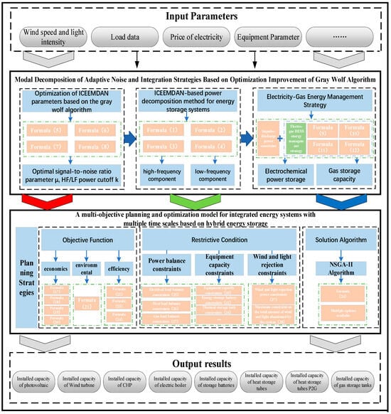 New energy sources, such as wind and solar energy, have been widely adopted; however, their volatility and instability have become the key issues restricting their utilization. To cope with this challenge, hybrid energy storage systems, as flexible regulation schemes, are capable of balancing the supply and demand of the power system according to different timescales and power demands, and enhancing the efficiency and utilization of new energy sources. Therefore, this paper proposes an integrated energy system planning and optimization method based on hybrid energy storage. Firstly, an adaptive noise integration empirical modal decomposition method based on the optimization improvement of the grey wolf algorithm is designed for the power allocation strategy of the hybrid energy storage system; secondly, for the electric–gas system, an energy management strategy for the hybrid electric–gas energy storage system, taking into account the operating characteristics of the alkaline electrolyzer, is proposed in order to strengthen the complementary mechanism between electric energy storage and gas energy storage. Finally, a multi-objective planning and optimization model for a comprehensive energy system based on a hybrid energy storage system is constructed. The combined configuration of long-term and short-term energy equipment can flexibly adjust energy supply and storage strategies according to demand changes on different timescales, achieve optimal resource allocation, and ensure the stability, economy, and reliability of the system. This paper uses a park in Shanxi, China, as a case study to validate the effectiveness of the methodology proposed in this paper. The example shows that the configuration of the electrical–thermal hybrid energy storage system proposed in this paper leads to a significant improvement in the economy, with an increase in annual profit of CNY 3.78 million, or 22.96%. At the same time, environmental protection is significantly enhanced, and total annual carbon emissions are reduced by 7.4 tons, with a reduction of 19.23%.