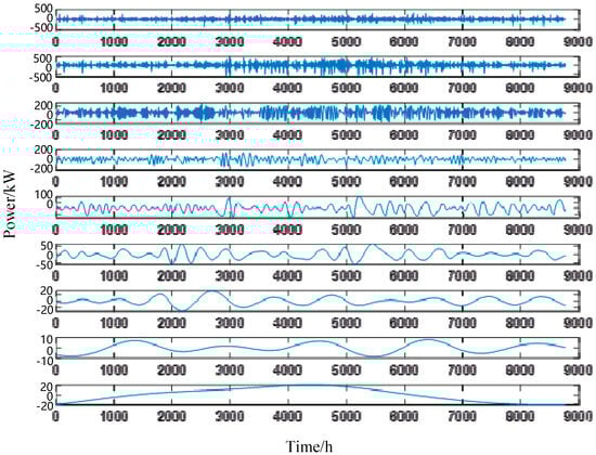 The raw power signal is processed using ICEEMDAN to obtain the intrinsic mode functions of each order. Since processing each IMF component separately would result in unnecessary workload, they are reconstructed into low-frequency components and high-frequency [25] components in combination with power fluctuation limits. The low-frequency components are assigned to gas energy storage and the high-frequency components are used for electrochemical energy storage power tasks [26], as shown in Equation (1).