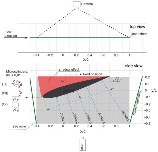 Experimental tests were carried out in a closed-circuit wind tunnel. The test chamber had a square cross-section, measuring 0.3 m in height and width, and a length of 2 m. The subject of this study was a NACA 0012 airfoil, to which a microcylinder was attached at the leading edge. The airfoil was located at the center of the wind tunnel measurement section. The airfoil chord was c = 200 mm. The blockage ratio in the test section was up to 20%, which is relatively high and could influence the flow characteristics by increasing the effective Reynolds number and altering the pressure gradients. It is important to note that the blockage ratio varies with the angle of attack. The standard corrections for the blockage effect were not applied in this study. This decision was made following a thorough comparison of the results with data from the literature, which demonstrated strong agreement even without the application of these corrections. Similar approaches have been successfully used in studies such as the work by [44] and ref. [45], where the reliability of experimental results without blockage corrections was validated through comparisons with computational and real-world data. Also, in the study [46] the authors systematically reviewed various cases where wind tunnel data closely aligned with full-scale measurements, suggesting that standard corrections had negligible effects under certain conditions. One such approach is described in the study [47], where the authors compared results from a conventional solid-wall tunnel with those from a slotted-wall tunnel. They found that blockage corrections had a negligible influence on the results. A similar method was employed in the paper [48], where numerical analysis revealed that wall effects had minimal influence on lift and drag coefficients, suggesting that wind tunnel corrections may not be necessary under specific conditions. The findings from these studies, along with the minimal deviations observed in the current research, suggest that the blockage effects did not significantly impact the validity of the results. In the first part of the research, the NACA 0012 airfoil was tested for various angles of attack: 12°, 15°, 17°, and 19°. After analyzing the results, an angle of attack of 17° was selected for further research due to the significant boundary layer separation observed at this angle compared to 12° and 15°. Subsequently, a microcylinder with a different cross-section was added at this selected angle of attack: triangular (Tr), the triangular microcylinder studied was an equilateral triangle, square (Sq), and circular (Cr). The center of the microcylinder was located upstream of the airfoil’s center axis. The microcylinder was attached directly to the leading edge of the airfoil. Specifically, the side edge of the microcylinder was in direct contact with the front edge of the airfoil. The square microcylinder had its flat edge in direct contact with the NACA 0012 airfoil. The triangular microcylinder had its top positioned parallel to the flow. A diagram of the experimental setup is shown in Figure 1. The airfoil was illuminated perpendicular to the direction of flow; thanks to this laser setting, the suction side of the airfoil was obvious to the camera lens. During the measurements for different angles of attack, the camera was located in a fixed place, but its position was changed in the second stage of the research. Thanks to this, we obtained a larger measurement area. This provided us with more information about what was happening below the suction side of the airfoil and what flow disturbances were introduced by the added microcylinders. Velocity field analysis in this study was conducted using the Particle Image Velocimetry (PIV) method to measure streamwise / [-] and cross-stream / [-] velocities, along with turbulent kinetic energy TKE/( [-] fields. The analysis provides a visual and quantitative assessment of flow separation and vortex behavior around the airfoil. The vortex size was determined using gradients in cross-stream velocity and regions of reverse flow identified in the velocity contour maps. Specifically, the vorticity contour maps highlight coherent rotational flow structures, and vortex dimensions were measured by the distance across the flow where these structures exhibit peak and trough velocity transitions. This methodology enables accurate characterization of vortex scale and strength, essential for understanding their impact on aerodynamic performance.
