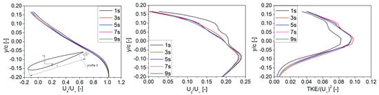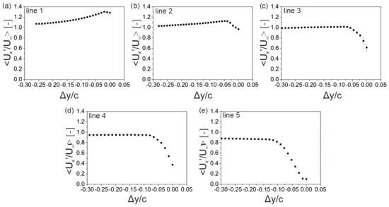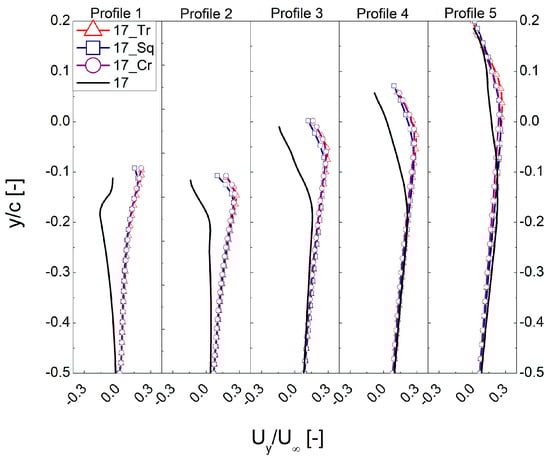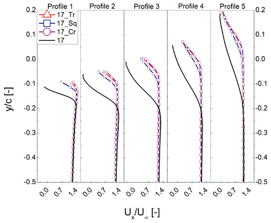 Figure 9 shows the evolution of the normalized streamwise velocity profiles / [-] along the suction side of the NACA 0012 airfoil for an angle of attack of 17°. The data compare the effects of different microcylinder shapes (triangular, square, and circular) with the reference case, where no microcylinder is applied. The profiles are labeled from 1 to 5, and their locations are marked in Figure 1. The data are plotted for four cases: without microcylinders—black line; with added microcylinders: triangular microcylinders—red triangles; square microcylinders—blue squares; and circular microcylinders—purple circles. From these data, we estimated the coefficient , referring to the vertical extent of the separated flow region. We have now clarified that this value represents the perpendicular distance over which flow separation occurs, up to the point where the streamwise velocity becomes a negative value (i.e., the separation point). In the analyzed plot, in Profile 1, the baseline case without microcylinders (black line) shows a velocity deficit near the surface of the airfoil, indicating negative velocities and flow separation with the vertical extent . This situation can lead to recirculation in the boundary layer separation and recirculation zone. This results in increased turbulence downstream. Base condition leading to a larger drag and potentially unstable flow patterns in the wake.