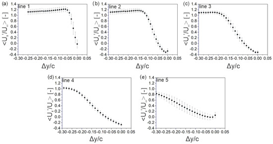Measurement uncertainty for angle of attack = 17° without microcylinder for: (a) line 1; (b) line 2; (c) line 3; (d) line 4; (e) line 5.