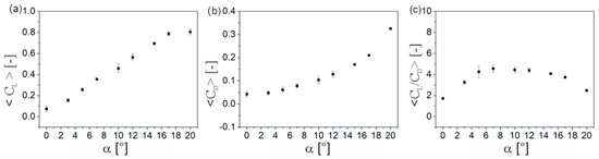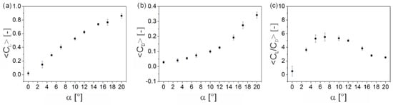 The accuracy of the measurements performed on the aerodynamic scale was assessed by analyzing the measurement uncertainty in two different configurations: without a microcylinder (Figure 5) and with a microcylinder of size d/c = 0.015 [-] (Figure 6). The measurement was repeated three times in each configuration, which allowed for a detailed analysis of the results and an assessment of the precision of the obtained data. Figure 6a shows the dependence of the lift coefficient [-] on the angle of attack [°]. It can be observed that the value of the coefficient [-] increases with increasing angle of attack. The graph also contains vertical error lines, which represent the measurement uncertainty for each of the data points. The values of the coefficient [-] increase gradually from a value close to 0 at = 0 [°] to about 1 at = 20 [°]. The apparent uncertainty is small, indicating good precision and reliability of the measurement results. Figure 6b shows the dependence of the drag coefficient [-] on the angle of attack [°]. The coefficient [-] also increases with increasing angle of attack, with values ranging from about 0 at = 0 [°] to about 0.3 at = 20 [°]. As in the case of the previous graph, error lines have been included for each data point, which show the uncertainty of the measurements. Figure 6c shows the aerodynamic efficiency / [-] as a function of the angle of attack [°]. At first, this efficiency increases, reaching a maximum at an angle of attack of 6–8°, after which it starts to decrease as the angle of attack increases further. Vertical error lines have also been added to this graph, indicating the uncertainty range associated with each measurement.