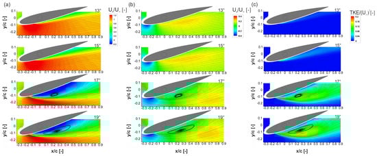 Contour maps for high angles of attack: 13°, 15°, 17°, and 19° degrees: (a) normalized streamwise velocity / [-], (b) normalized cross-stream velocity / [-], and (c) normalized turbulent kinetic energy TKE/( [-].