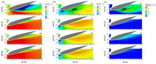 The flowfield around the NACA 0012 airfoil at 17° angle of attack, without microcylinders and with microcylinders added: (a) normalized streamwise velocity / [-], (b) normalized cross-stream velocity / [-], and (c) normalized turbulent kinetic energy TKE/( [-].