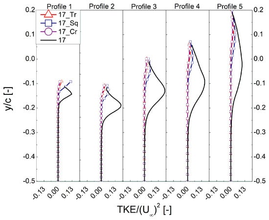 Figure 11 shows the evolution of the normalized turbulent kinetic energy, along the suction side of the NACA 0012 airfoil, for the case without added microcylinders (black line) and with different microcylinder shapes (triangular, square, and circular). In Profile 1, the baseline without microcylinders shows high TKE values, indicating high turbulence. The microcylinders reduce TKE, with the circular shapes (purple circles) providing the best stability, followed by the triangular (red triangles) and square (blue squares). In Profile 2, this trend continues, with the black line showing high TKE values. The microcylinders reduce turbulence, with the circular shapes maintaining the lowest TKE values. Profile 3 also indicates high TKE values for the black line. The microcylinders improve stability, with the circular shapes maintaining the lowest TKE values. Profile 4 shows high TKE values for the black line, but the microcylinders reduce TKE, with the circular shapes achieving the lowest values. The triangular microcylinder shows a significantly lower TKE than the square microcylinder, which only marginally exceeds the TKE of the circular one. However, for the square microcylinders, there is a noticeable increase in the TKE values close to the wall, which should be considered as it contrasts with the general trend. Profile 5 reflects significant turbulence, with high TKE values. The microcylinders enhance stability, with the circular shapes performing the best, followed by the triangular and square ones.