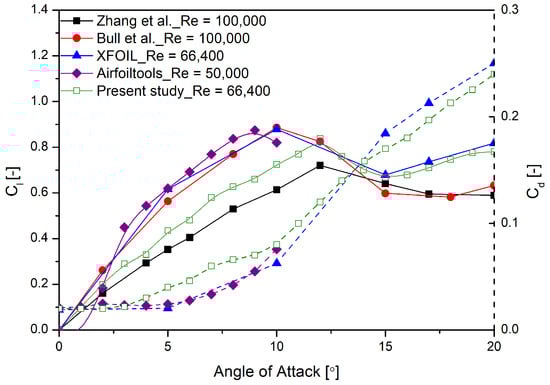 The experimental data (Re = 66,400) closely match the trends reported by [44,54] (Re = 100,000). The XFOIL [55] data (Re = 66,400) and the Airfoiltools [56] data (Re = 50,000) show a comparable trend with a slightly lower peak . The rise and fall in are more pronounced, indicating a sharper flow separation. Variations in the maximum Cl and the angles at which flow separation occurs reflect differences in Reynolds number, indicating its influence on boundary layer dynamics.