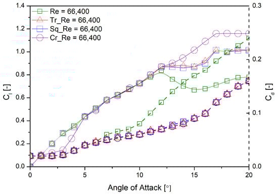 Figure 13 illustrates the lift coefficient [-] and the drag coefficient [-] for the NACA 0012 airfoil with added microcylinders of different cross-sections: triangular (Tr), square (Sq), and circular (Cr), all at a Reynolds number equal 66,400. The lift coefficient [-] without microcylinders is marked by a green line with squares on the graph. Upon analysis of the data, it is evident that adding microcylinders with varying cross-sections led to an augmentation in the lift coefficient [-], particularly noticeable for angles exceeding 12°. All cross-sections show an increase in as the attack angle increases. The circular cross-section (Cr) consistently shows the highest across all attack angles, particularly notable at higher angles, showcasing superior lift performance. The triangular (Tr) and square (Sq) cross-sections have similar trends, but the square cross-section generally shows higher values than the triangular one. A more substantial increase in the lift coefficient is observed for microcylinders with circular cross-sections compared to those with triangular and square cross-sections. For lower angles of attack, the lift improvement due to the microcylinders is less pronounced. However, beyond 12°, all configurations demonstrate marked increases in , with the circular cross-section outperforming the others. A distinct reduction in for the circular cross-sections (Cr) at 3° indicates potential flow disturbances or high blockage effects, suggesting specific flow phenomena around this geometry.