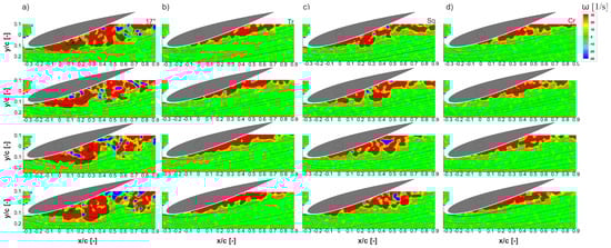 Evolution of vorticity for a NACA 0012 airfoil, for an angle of 17°, where t = 0.004 s: (a) without microcylinders, (b) Tr (c) Sq and (d) Cr.