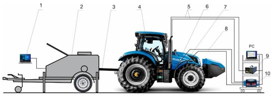 The ZW500 mobile dynamometer unit (Figure 1) was designed for testing agricultural tractor engines via its Power Take-Off (PTO). The main technical characteristic of this device, which was equipped with electronically controlled eddy current brakes and mounted on a trailer chassis, are reported in Table 2.