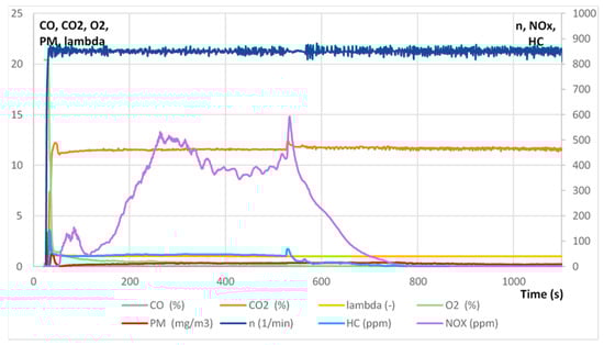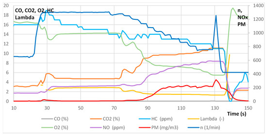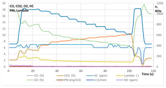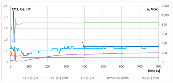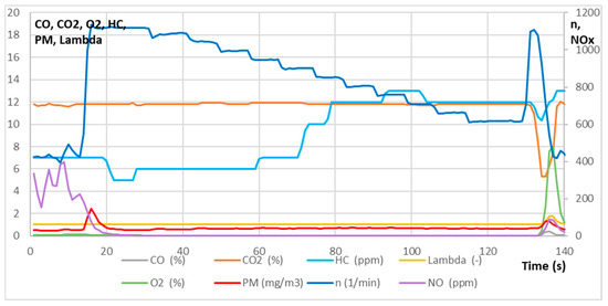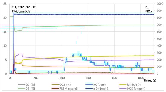 In establishing the operational characteristics, the emissions of PM, CO2, CO, O2, HC, and NOX, as well as engine oil temperature and engine rotational speed, were recorded (Figure 8 and Figure 9).