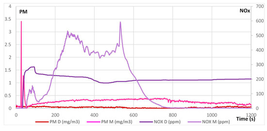 NOx and PM concentrations in the fumes for MPs and DEs during the cold start and warming-up periods.