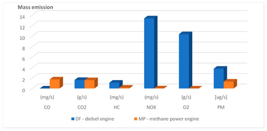 Comparing the lambda values (MP—1 and DE—6.9) for idle operation and considering the AFRs for stoichiometric mixtures of both fuels, based on Formula (2), it can be demonstrated that the exhaust gas flow rate for the MP engine during idle operation will be approximately 5.6 times smaller than that of diesel. Hence, the conclusion can be drawn that despite higher volumetric fractions of NOx or PM for the MP engine, the overall emission of these components will be lower over the same period due to the significantly smaller exhaust gas flow rate (Figure 5). This is a significant observation as it indicates a less environmentally burdensome impact of this type of propulsion.