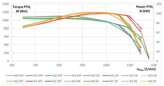 After correction according to the DIN 70020 standard and considering environmental parameters (Ta = 20 °C, ϕ = 59%, pa = 1000 hPa, pg = 16 hPa), the maximum power (N) and torque (M) at the power take-off (PTO) shaft were determined. These values averaged 102.2 kW for the DE and 100.3 kW for the MP engine. Interestingly, these results are nearly 10% higher than the manufacturer’s stated values for the tractors (93 kW for DE and 92.5 kW for MP).