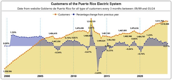 Figure 1, which displays the number of customers (orange line) and their percentage change compared to the previous year (purple line). While there were decreases in customers registered by the AEE in 2007, parts of 2013, 2014, and between 2019 and 2020, the median growth rate from 1999 to 2024 was 0.5%.